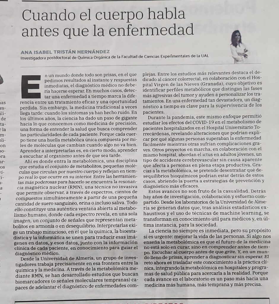 The article titled «Cuando el cuerpo habla antes que la enfermedad» explains how NMR-based metabolomics can support early and more accurate disease diagnosis.